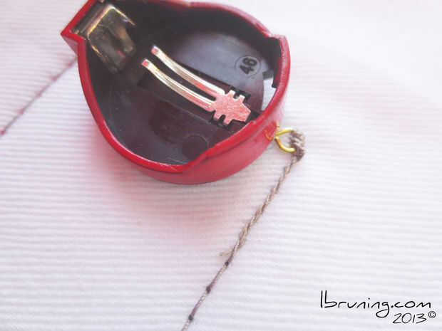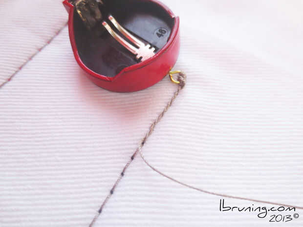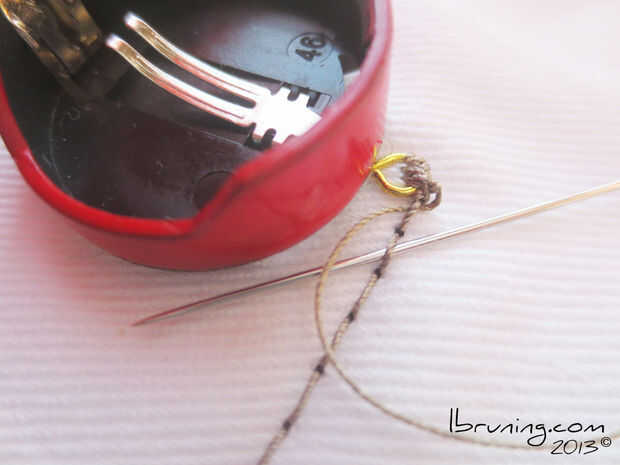 Usando los extremos del hilo y una aguja de coser de mano puntada del acumulador de titular a las correspondientes huellas de hilo conductor.