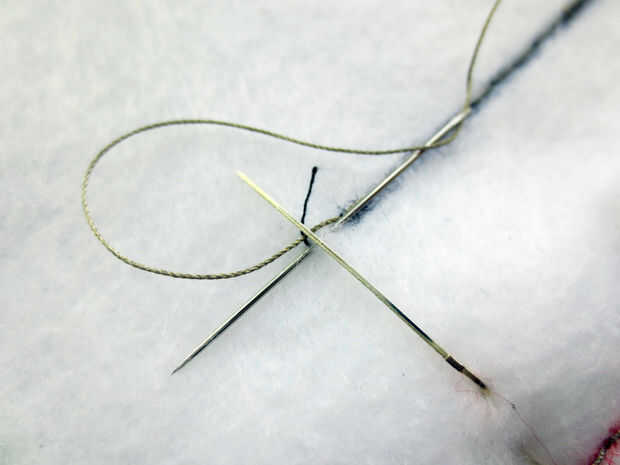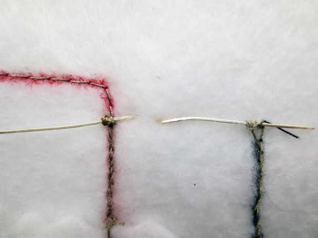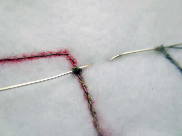 Enhebre la aguja de coser de mano con las colas de hilo conductor y coser los cables de LED en su lugar.
