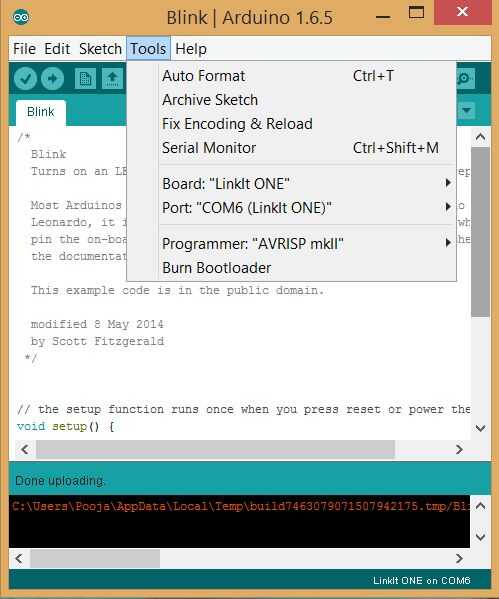 2) en el IDE de Arduino, vaya al menú desplegable de herramientas en la parte superior, seleccione Junta y "Uno de LinkIt" está marcada.