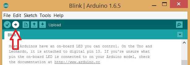 Se abrirá una nueva ventana de dibujo con algo de código en él. Haga clic en el botón de subir en la barra de herramientas. Puede tomar un momento para compilar y cargar en la Junta.