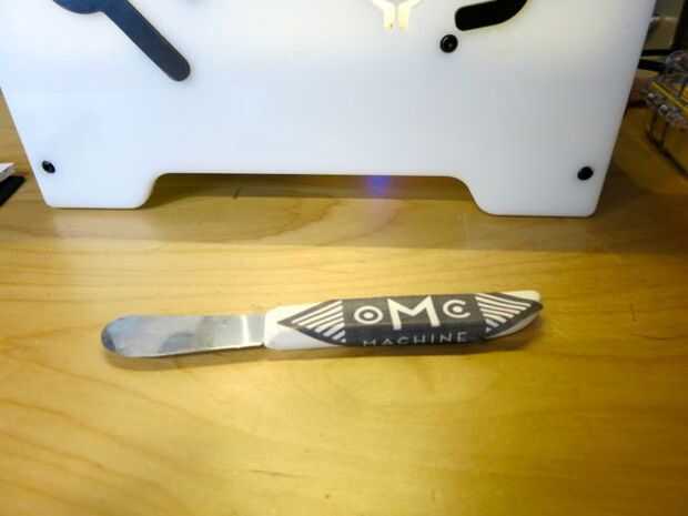 Suavemente Levante la tabla cortada fuera de la cama de la máquina con una herramienta plana, Roma de algún tipo. Nos gusta este raspador sencillo. Un cuchillo de queso o un raspador de pintura también funciona, pero tenga cuidado de no dañar la placa.