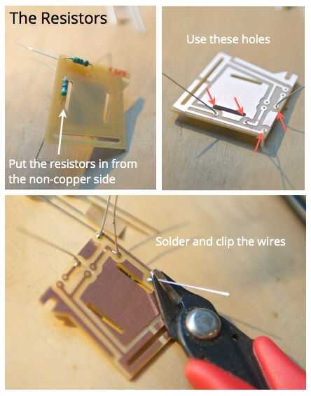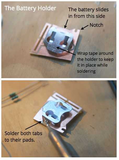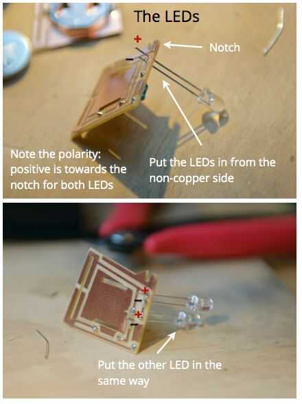 Usar esto para tener una idea de donde van los LEDs, resistencias y soporte de la batería, y en qué lado está montados. Una vez usted entienda donde van, aparte el modelo y seguir estas fotos para soldarlos: