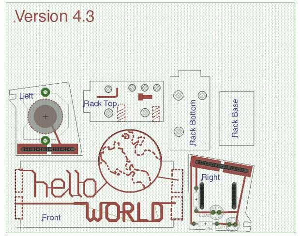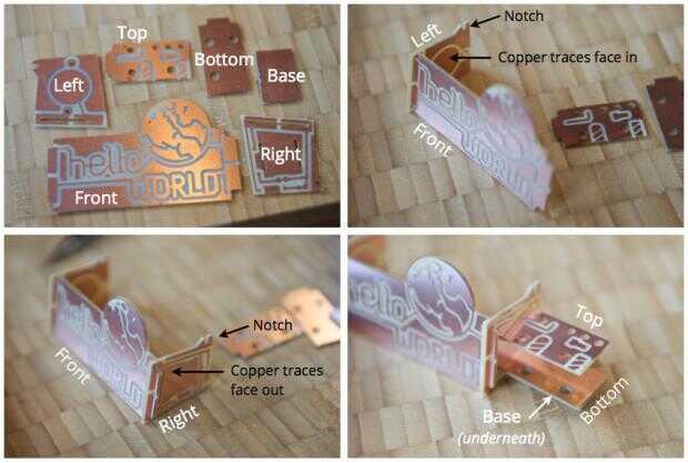 Es más fácil soldar los componentes electrónicos antes de montar los pedazos juntos, pero es útil entender cómo encaja la estructura juntos antes de empezar a soldar los componentes. Así que encajar las piezas con las instrucciones en la foto de abajo.