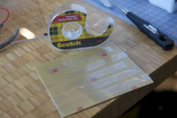 • En el lado no cobre del PWB FR-1 en blanco, poner una capa uniforme y sin traslapo de cinta de doble cara a través de toda la superficie.