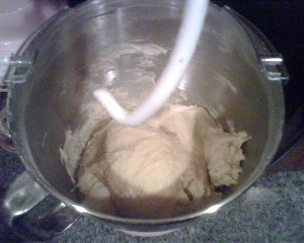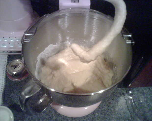 mantener la mezcla unos dos minutos más hasta que la pasta se pega el gancho y tira de los lados.