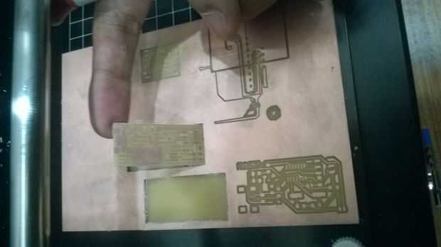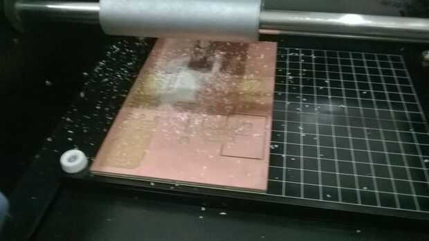En los módulos de la Fab tiene comando de .rml make y luego enviarlo a modella. Espere hasta que el trabajo está hecho. Después de cortar los rastros cambiar la broca 1/32 y repetir el proceso utilizando módulos de Fab usando Tabla cortada .png fil. Esto hará un corte alrededor de nuestro circuito de modo que podemos eliminar de la tabla más grande.