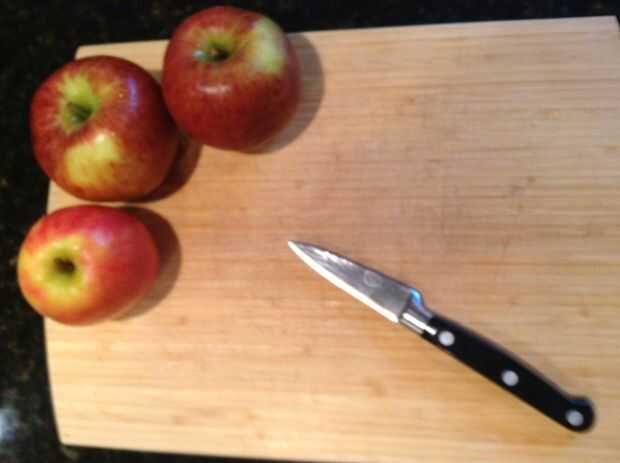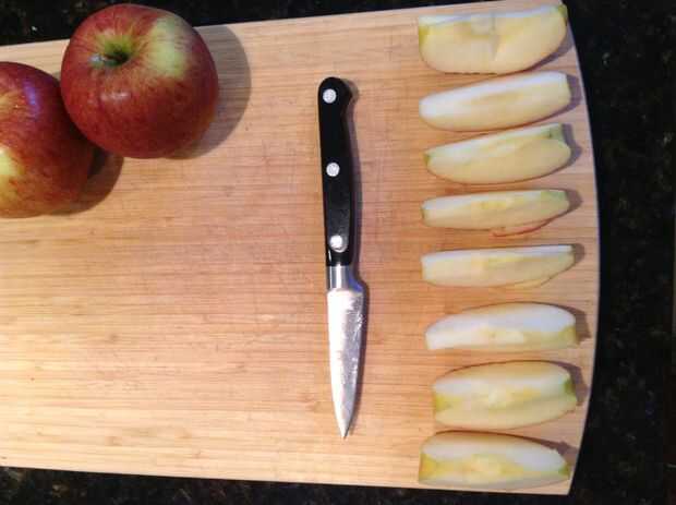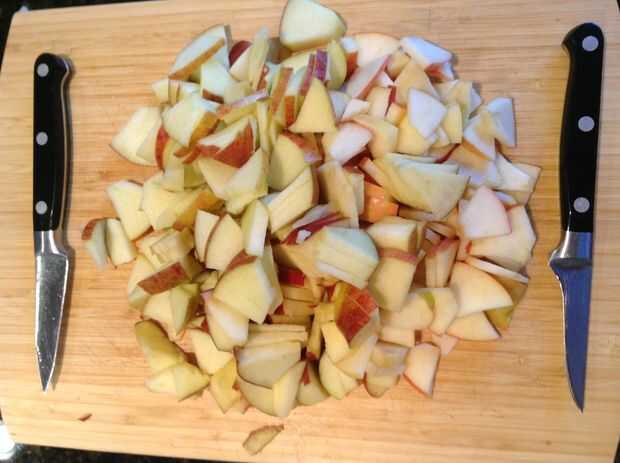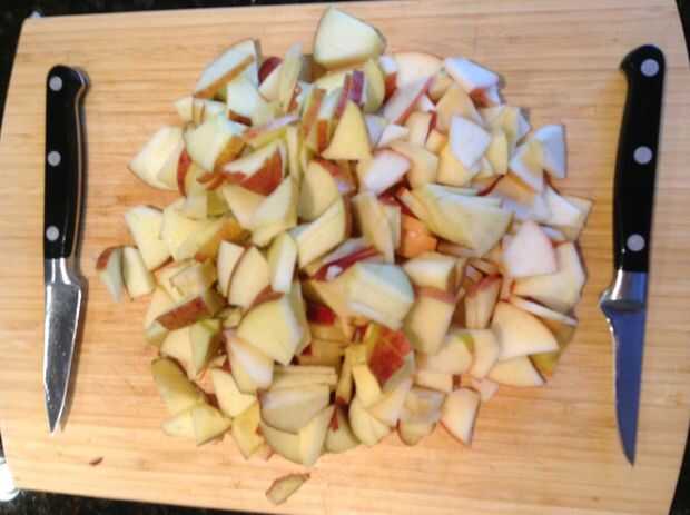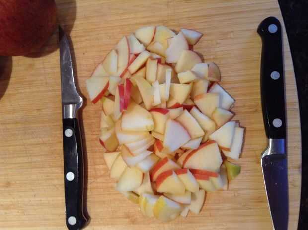 Comience por lavar tus manzanas y colocarlas en una tabla de cortar. Coger un cuchillo, y pero las manzanas por la mitad y luego en cuartos. Quitar las partes más íntimas con las semillas y deshacerse de ellos. Cortar los cuartos en octavos y luego picarlos finamente. Si usted tiene alguna pregunta sobre cómo éstos deben buscar, por favor consulte a los cuadros 3, 4 y 5 de este paso. Usando sus manos, empuje las manzanas en un recipiente cualquiera, o sólo mantenerlos en el tablero de corte.