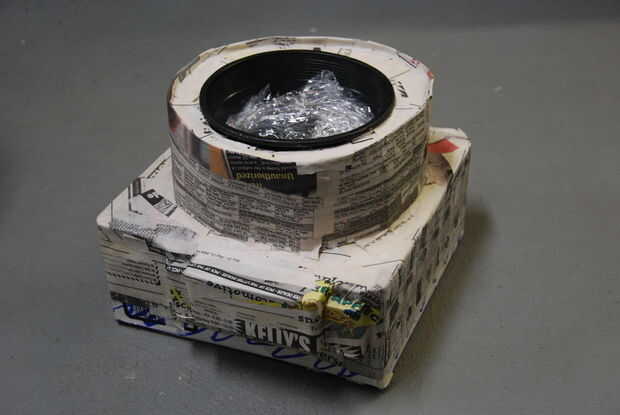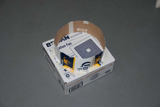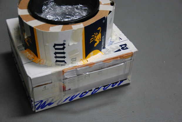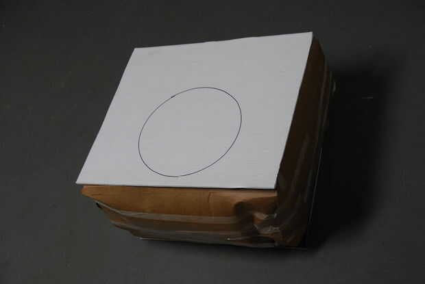 14. entonces yo había asegurada la lente dentro de la caja de"lente" con cinta y un círculo de cartón corrugado.