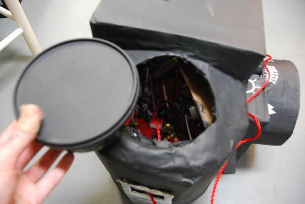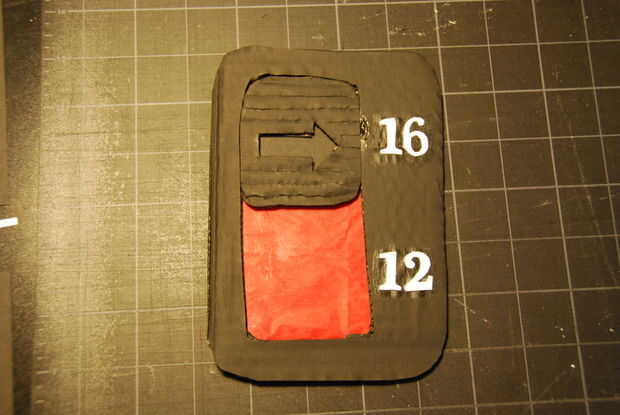 27. otra vez, cartón corrugado se utiliza para el interruptor trasero. Corte las formas, pintadas y utilizó más empaquetado plástico claro y algún papel de seda rojo para crear la ventana roja de"poco"