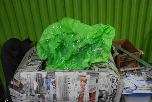 16. cubrir con una capa de papel maché, rellenando los huecos con pequeños periódicos arrugados. Ya que esta parte no tiene que soportar cualquier peso o haz manejado demasiado, una fina capa de maché está bien. He pulsado algunas envoltura de plástico transparente sobre la lente para evitar goteos.