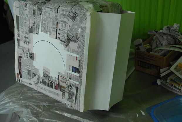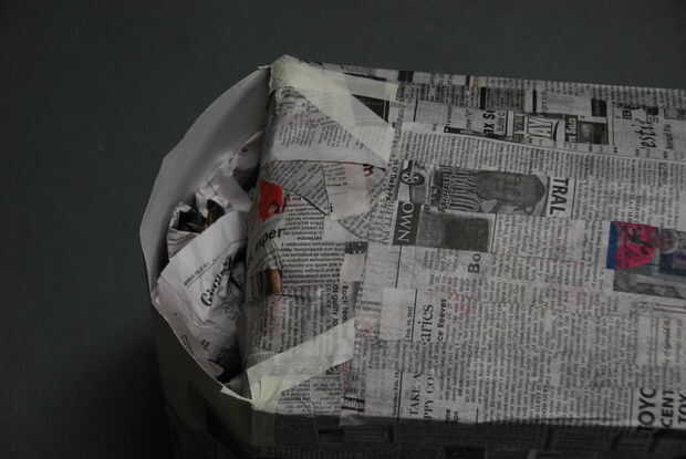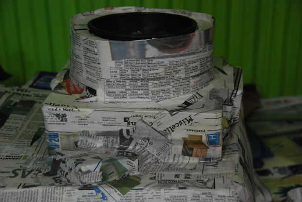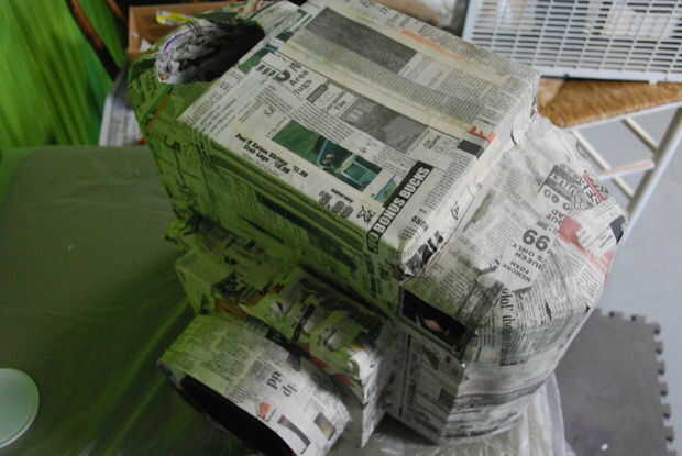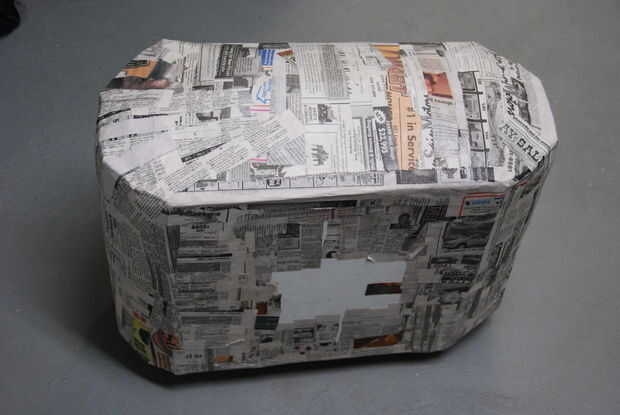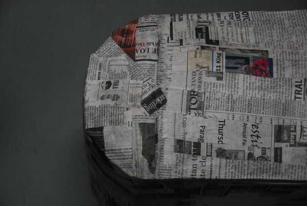 10. sellar tapas y partes inferiores con al menos 2 capas de papel maché. Utilice más periódicos arrugados como vas a rellenar huecos y bordes irregulares. Esta es la mejor parte acerca de papel maché. Si la forma no está bien, puede agregar rápidamente a granel más en las áreas donde lo necesite. Deje que este seco completamente.