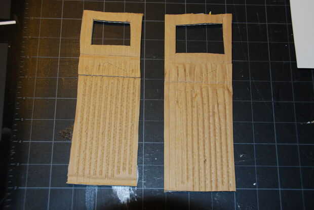 26. utiliza cartón corrugado para hacer los clips laterales. Tomé un lápiz Romo y presionado entre el gooves cartón para hacer las crestas. A continuación los cubrí con papel de aluminio.