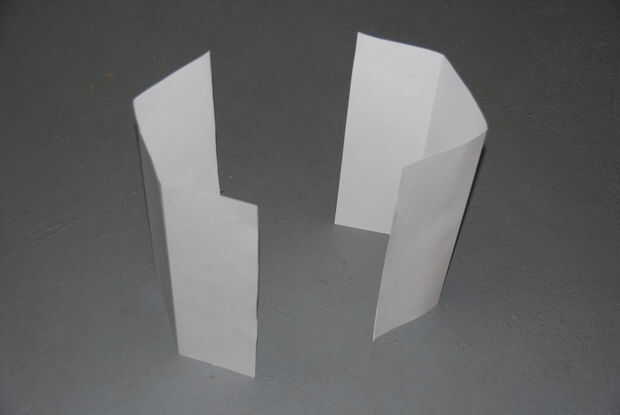7. corte 2 piezas de cartón delgado o cartulina a la altura del rectángulo y lo suficientemente amplia como para doblar en tres partes y cubrir los lados del rectángulo. Estas ayudarán a crear los lados cónicos de la Holga.