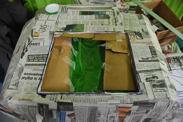 9. Llene ambas cavidades con periódico arrugado que ha sido humedecido ligeramente con papel maché. No hay que saturar completamente.