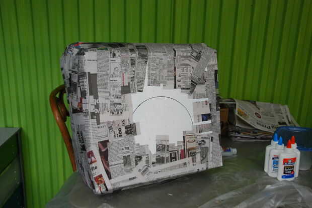 Me gusta utilizar blanco todo propósito y la escuela (también han usado harina y agua en un apuro pero el tiempo de secado es más largo. Yo no te molestes con el método adhesivo de papel pintado porque odio la textura y el olor.) Mezclo mi pegamento de papel maché aproximadamente 1 parte de a 2 o 3 partes de agua. He encontrado que esto varía con la marca del pegamento. Pero la consistencia que me gusta es la de una sopa espesa. Demasiado espeso significa que ir a través de un montón de pegamento. Demasiado fino y no se pega el papel después de que el agua se evapora. I mezclar un lote grande para un proyecto tan grande y mantenerlo en un recipiente plástico hermético. También, rasgando una caja llena de tiras de periódico en el principio ahorra tiempo más adelante. Y una pila de viejos periódicos en brazos alcanzan para construir y formar más adelante. Recuerda que tienes que trabajar en etapas, permitiendo que el papel maché se seque entre capas. Tener un ventilador cerca activar ayuda a acelerar el secado.