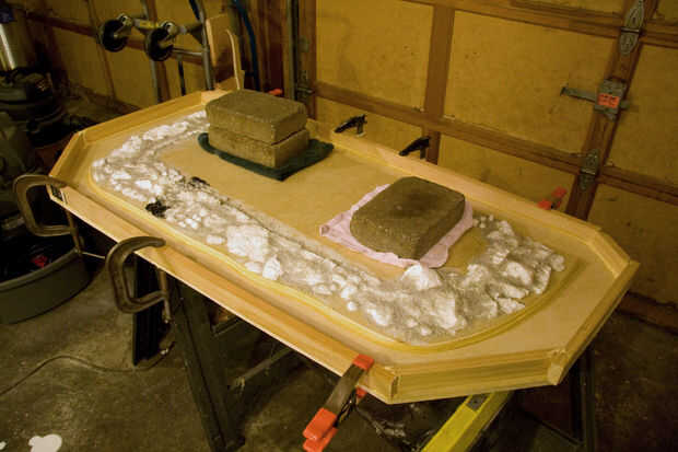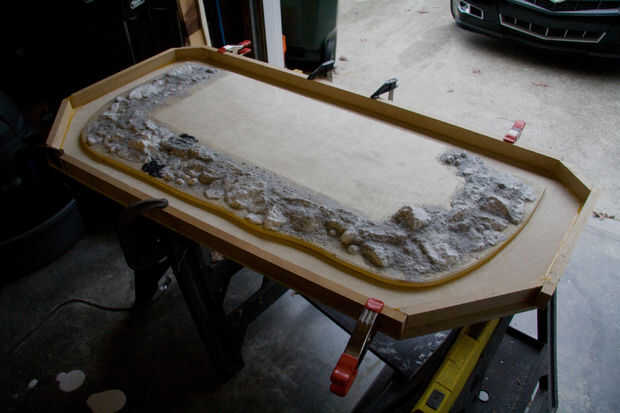 El molde para el terreno será una pieza de una pieza relativamente simple de silicona. El molde de chaqueta (la cáscara de fibra de vidrio que soporta la silicona) supone un reto mayor debido a su tamaño. Monte el terreno con algun pegamento a una hoja de madera contrachapada de 1/2 pulgada que es aproximadamente 2 pulgadas más anchos que el terreno más grande. Asegúrese de que la base del terreno se sella firmemente por el pegamento para evitar que cualquier silicona curado bajo el modelo de terreno. Añadir algunas paredes de madera a la base para mantener el contenido de silicona.