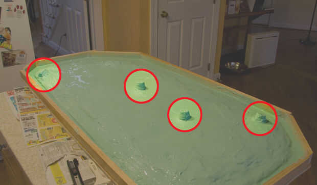 Como antes, utilizará una proporción 1:1 a la 40 de rebote de la mezcla. Aplique 2 capas de este caucho hasta adecuadamente han cubierto el 25 de rebote (con 8 horas entre capa y capa). Mezcla una tercera y final por lotes con el espesante de silicona y tienen sus claves de registro de caucho listos. Usted necesitará usar agitador de pintura de deber más pesado para aplicar la silicona ya que será demasiado pesado y grueso para aplicar con un pincel. Meter las claves de registro en la goma gruesa en puntos uniformemente espaciados en la parte superior del molde.