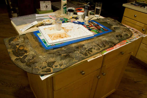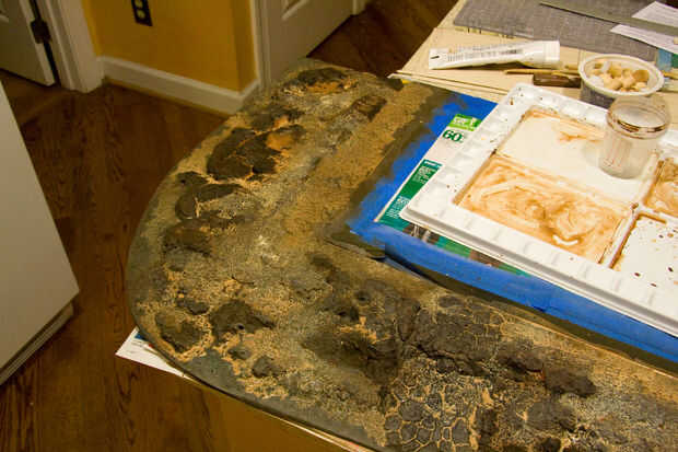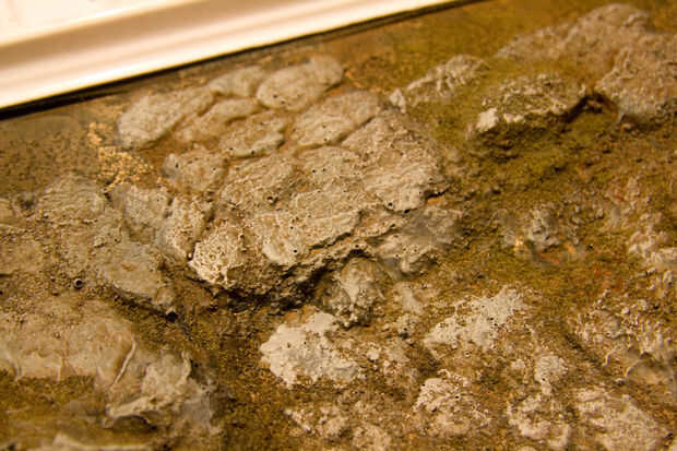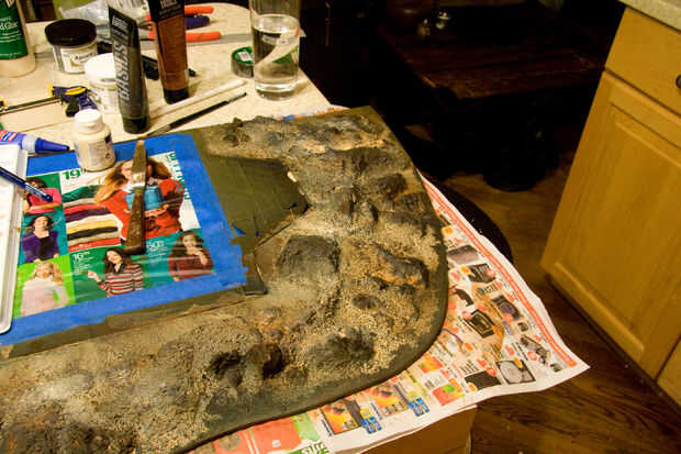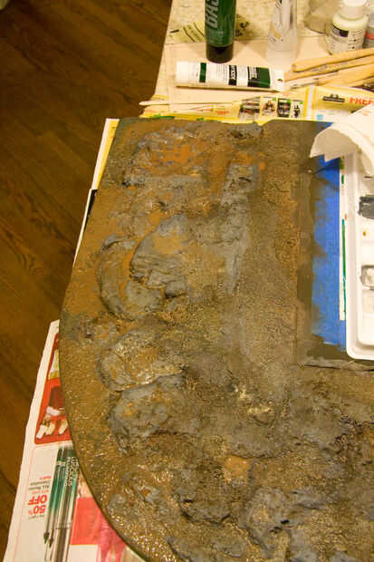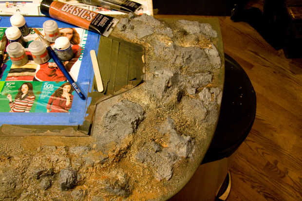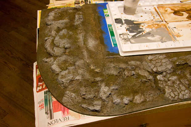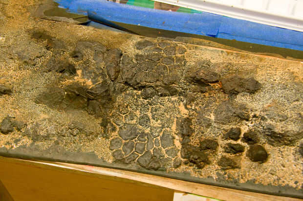 Comience pintando su terreno con sutil lavado de burnt sienna, raw umber y titanio sin blanquear. Los lavados deben ser super finas y permitidos para recoger y secar alrededor de cada pequeña grieta y guijarro. Permita que cada lavado secar varias horas antes de capa en otro lavado. Repita este proceso hasta obtener un efecto variado sobre la roca y el suelo. El efecto final sería algo fangoso, que es bueno ya que se trata de la capa base que subyace en su vegetación y estría la piedra.