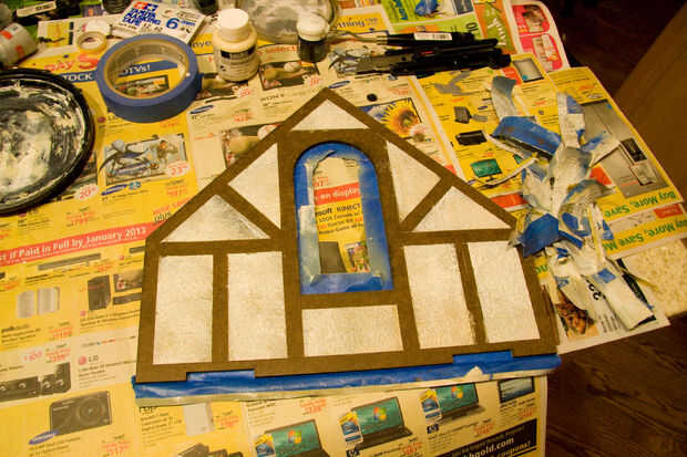 Esta es la fase donde se pintar y montar las fachadas que más adelante comprenderá la casa terminada. Comienza cubriendo la Tudor recortar áreas con la cinta azul de pintores y la cinta de enmascarar 10 mm. Las áreas de recorte necesitan permanecer claro de pintura para que pueda leer el número grabado a láser y pegar la moldura más adelante.