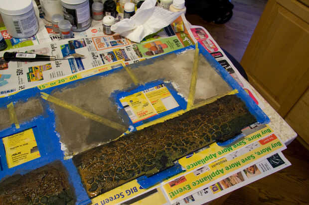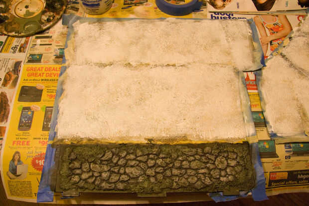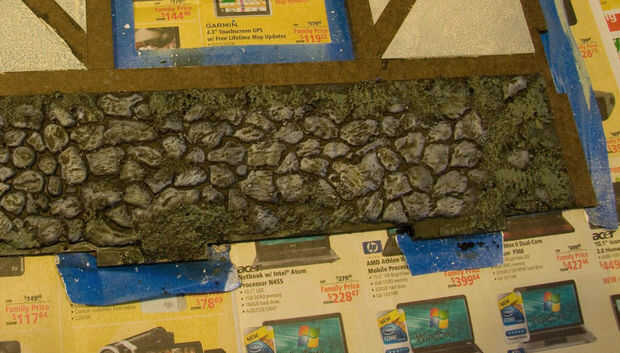 A continuación, necesita crear los paneles de piedra en la base de la pared. Tome algunas hojas de la fachada de roca escala O estireno y corte a las dimensiones de la pared inferior. Primera de estas hojas de rocas con pintura en aerosol negro como lo hizo con la piedra del terreno. Desea esta capa oscura para el sombreado. Pegamento estupendo los cebada paneles a la pared más baja entre las áreas de cinta adhesiva. Mezcla poco piedra pómez gruesa de gel con alguna pintura acrílica negro y trabajar en la roca para simular la lechada y musgo. Deje que se seque. Mezclar un lavado de enrarecido Calthan Brown y déjelo funcionar entre todos de piedras. Diluir algunos Catachan Green y lavar en las piedras más bajo en la pared y en los grumos más grandes de gel de piedra pómez. Esto agregará alguna variación y simular la acumulación de musgo cerca del suelo. Estos matices variados impide que la roca de cepillado en seco mirando demasiado uniforme.