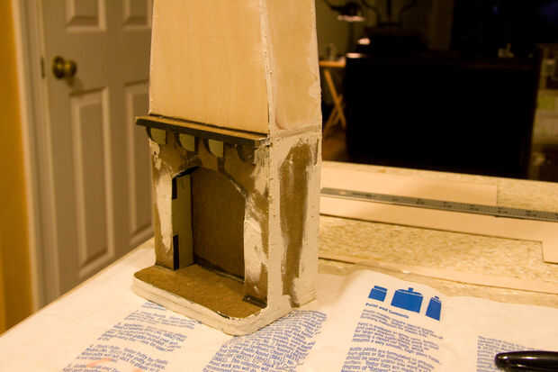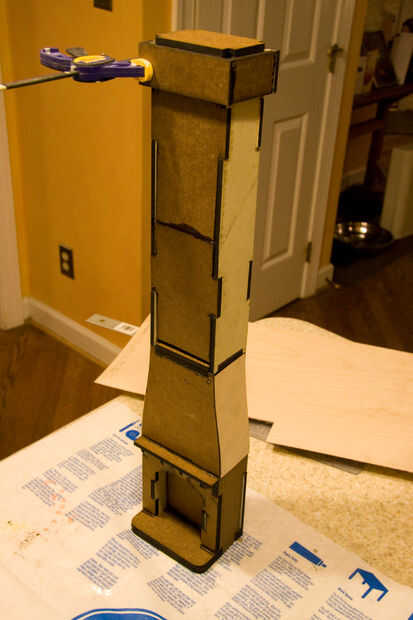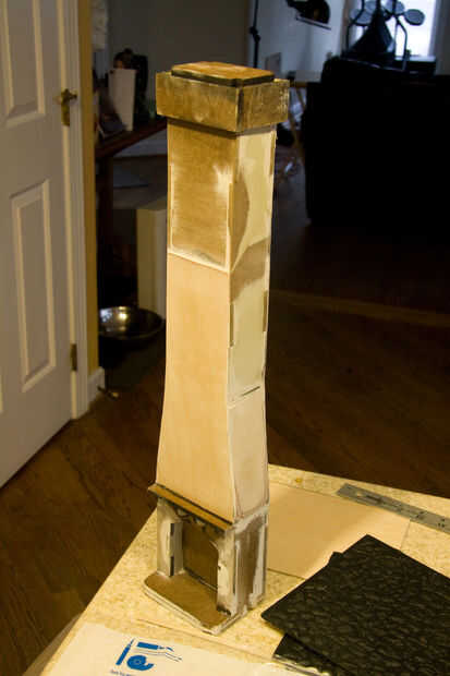En esta etapa, a modelo de la chimenea que ocupa el centro de la casa. La chimenea pasa a través del primer piso y el techo por lo que vas a querer construirlo es una sola pieza y corta más adelante en los puntos donde intersecta con los planos antes mencionados. Recoger las piezas de corte por láser y comenzar a pegar las formas. Esta parte debe ser relativamente rápido y fácil si fueras vigilante sobre el diseño de ranuras y lengüetas en las ranuras antes de corte por láser.