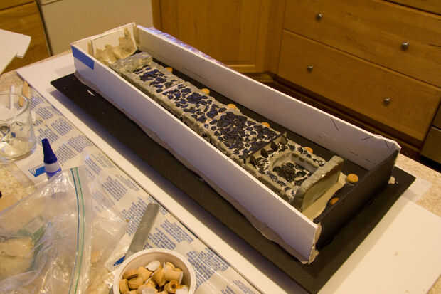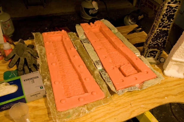 Ahora que has terminado la primera mitad de tu molde de silicona, usted tendrá que construir un molde de chaleco rígido de fibra de vidrio. El proceso de crear el molde de chaqueta para su chimenea será similar a la chaqueta que hiciste por el terreno pero ya que es una chaqueta de la 2 parte, tendrá que tomar algunas medidas para evitar que curar juntos. Antes de empezar tendrá que quitar las paredes del contenedor alrededor de la silicona. Suavemente el rasgón les de su pared de partición base. Rodar algunos arcilla en tubos y péguelas a la base. Estos tubos servirán como sus claves de registro para los moldes de chaqueta. La fibra de vidrio se contornea sobre el barro en jorobas redondeados que las conchas que encajan perfectamente.