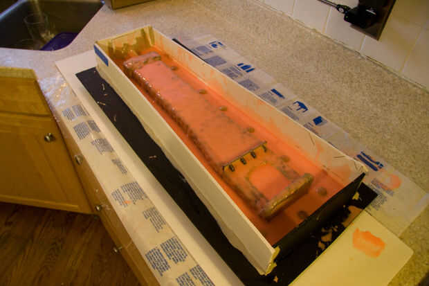 Preparar el molde trazando la forma de la chimenea en un pedazo de núcleo de espuma dejando 6 pulgadas de espacio por todos lados. Corte la forma con un cuchillo y anidan la chimenea dentro de ese espacio. Esto servirá como la pared de separación entre ambas mitades del molde. Llenar los vacíos entre la espuma y el modelo con algunos Klean Klay y alíselo. Usted quiere asegurarse de que cada lado del molde es sellado para evitar que el silicón del moldeado que se escapa a través de. Algunos botones de madera manía a la base de la espuma del pegamento estupendo intervalos incluso alrededor del modelo. Estos servirán como las claves que permitirán que las piezas del 2 molde caber juntos. Super pegue algunas paredes de núcleo de espuma baja a la pared de partición para crear un contenedor para la silicona. Pegue estos muros a su núcleo de espuma base aproximadamente 3 pulgadas de su modelo y 3 pulgadas desde el borde de su base. Klean Klay se aplican a las esquinas interiores de la caja de la base de esta espuma para asegurarse de que no sale silicona. Una vez que haya terminado usted necesitará crear un agujero Vierta y aire para su resina. Rodar algunas arcilla en 2 formas de tubo y conectarlos a los potes de la chimenea y la pared del núcleo de espuma. Hacer un tubo más ancho que el otro. El tubo ancho servirá como su agujero vierta. El tubo estrecho servirá como el agujero de aire que permitirá que el aire escapar de su molde cuando se vierte la resina.