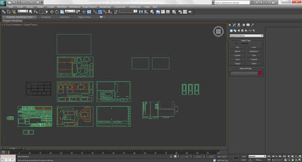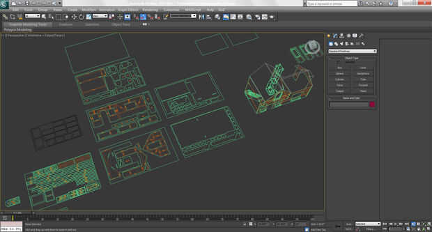 Una vez terminado el modelo puede comenzar a romper las formas que le gustaría tener láser corte. Consulte con el servicio de corte láser que va a utilizar para determinar el tamaño de su cama de corte antes de organizar las formas en un espacio de trabajo. Seleccione los bordes de la forma que desee y utilice la opción de Crear forma desde selección Editable Poly. Esto creará una forma Spline Editable. Mover las formas spline de su modelo y póngalos en una forma que se aproxima el espacio de la cama del corte. En mi caso, el espacio de corte mide 18 x 22 pulgadas. Asegúrese de agrupar las formas por tema; pisos, puertas, escaleras, paredes, chimenea y adornos. No quiero tus piezas arreglados junto con sus pisos, escaleras o las paredes ya que se cortarán las piezas de una hoja más delgada de madera y sus paredes se cortarán de estireno. Además, asegúrese de que su ajuste y escaleras están dispuestas a seguir la veta de la madera.