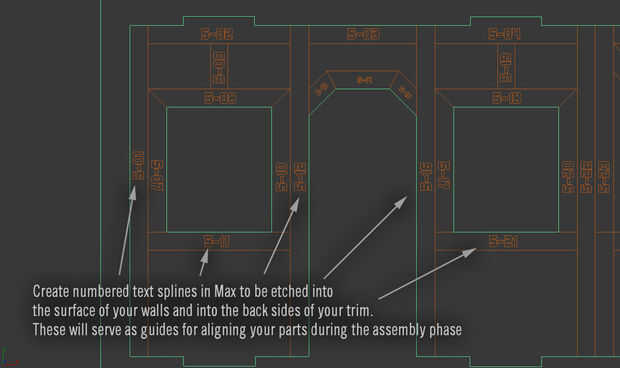 Habrá muchas piezas de ajuste para realizar un seguimiento de y aplicar como construyes. La mejor manera de dar sentido a cómo organizar su ajuste será láser grabado números a los lados detrás de la moldura y en la pared prefabricada donde Coloque. Se puede ver en las fotos que cada pedazo de recorte tiene un número y que número corresponde a un número grabado en el punto de conexión en la pared. Este enfoque de "Construir-por-números" hará su vida mucho más fácil cuando usted monta todo. Que te desee voltear las ranuras de ajuste como arreglarlos por lo que sus diseños están invertidos antes de agregar los números correspondientes. Desea que los números grabados en el adorno para pegar contra los números grabados en la fachada.