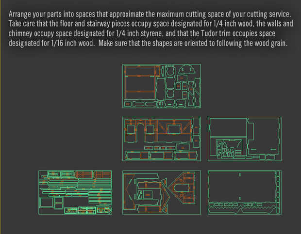 Es importante tener en cuenta que servicios de corte láser requiere que tu tiras diferentes colores para el corte y grabado. No desea que su guía números a cortar a través de su madera así que son un color diferente antes de enviar tu spline para corte. Usted puede ver en las imágenes que las líneas de corte son de color verdes y los números a ser grabadas son naranja. Es probable que tenga bastantes espacios de trabajo para cortar. Exportar cada espacio como un. DXF y nombrarlas por consiguiente (pisos, escaleras, ventanas, paredes, chimenea, adornos, etc.).