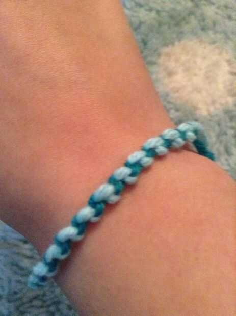 una pulsera bastante sencillo que sólo requiere 1 nudo. Utilicé 4 colores (1 azul, rojo 2, naranja 3, amarillo 4) pero se puede elegir en cualquier lugar entre 3-8 colores.Materiales que necesitas:-Cadena (a veces llamada seda en tiendas de artesaní