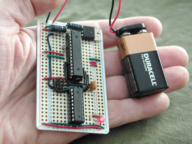 En el formato de la Arduino y tableros similares, estos chips están rodeados con un cristal de reloj apropiado o resonador, una fuente de alimentación regulada, alguna fuente de alimentación y otros condensadores de desacoplamiento de crítica-pin y social unos para monitoreo del estado. Pero puede ejecutarlos sin esta arriba. Si su tiempo es no crítico y no está preocupado por el accidente ocasional, puede tener un ordenador completo con nada pero el chip central y una batería.
