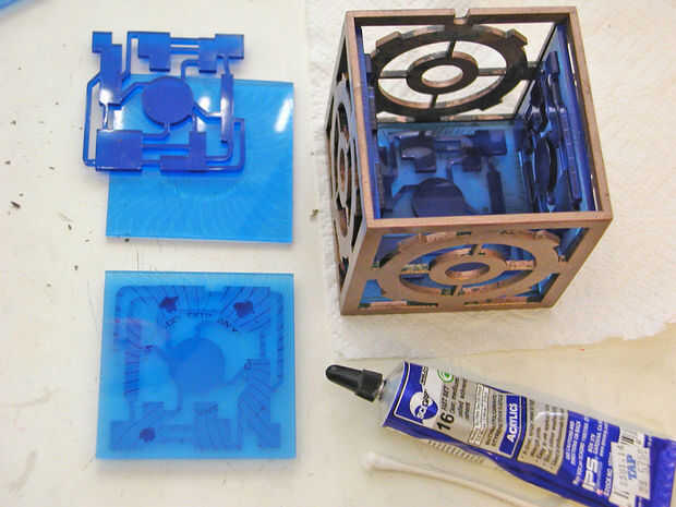 Para añadir aún más complejidad, I laminado los paneles difusos con patrones de corte en un plástico translúcido oscuro. Estos también están diseñados para cubrir el punto de acceso donde se sientan los LEDs.