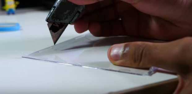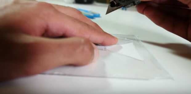 Tomando la forma de trapezoide, corte cuatro del mismo tamaño exacto de la parte transparente de la caja del CD.