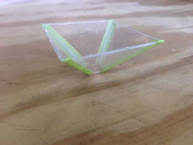.Paso 1: Lo que usted necesita: Para comenzar este proyecto se necesita lo siguiente:-Plástico delgado (puede ser el empaque)-Una regla-Cinta-Arma de pegamento caliente (con palos de la pistola de pegamento caliente)-Un triángulo equilátero para traz
