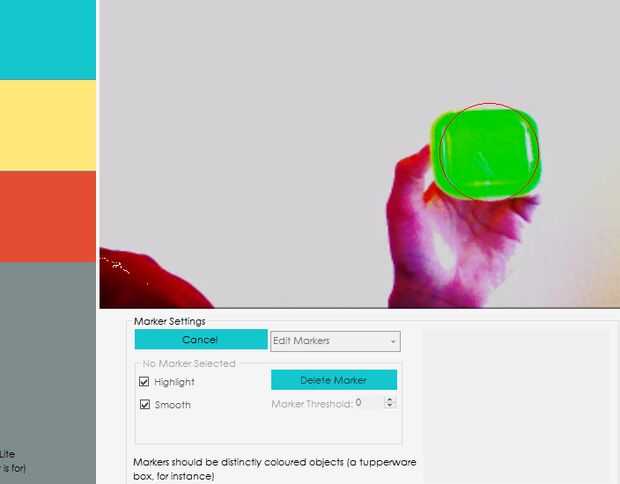 Haga clic en la ficha de seguimiento . Esto le llevará a algunas opciones del marcador. Sostenga el objeto coloreado delante de la cámara y haga clic en Agregar marcador. Debería congelar la alimentación de la cámara, que le permitirá seleccionar el marcador de clic en su centro y arrastrando hacia el exterior. Si algo sale mal, simplemente seleccione el marcador en el cuadro de lista desplegable Editar marcadores y haga clic en eliminar marcador.