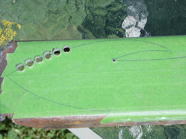 Para los dientes en el borde del manto superior de la cuchilla, utilice un punzón para marcar los puntos centrales en la línea de lápiz y taladrar los agujeros antes de iniciar el corte del cuchillo.