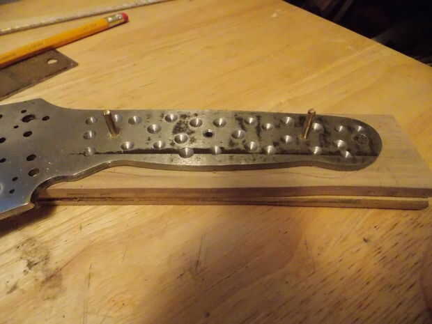 Poner una placa de soporte de desecho en el taladro, luego la pila de escalas.  Usa la espiga de la cuchilla para situar la primera posición por el primer pin y el taladro a través del agujero en el tang con una 1/8" bit a través de la pila de escalas. Aunque uno de sus pernos empuje la espiga y en el primer agujero en sus escalas (para mantener en posición). Taladre el segundo agujero a través de la espiga y las escalas de empujar en el segundo pin y finalmente el tercer agujero de taladro.