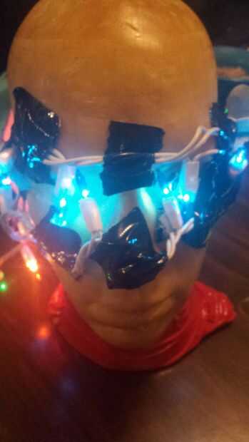 me daba miedo el factor calor de la lámpara, así que tomó algunas luces de Navidad y poner todas las luces azul hacia el frente de grabar a una vieja cabeza de maniquí. Que vuelva esto cuando encontrar un filamento con un interruptor.
