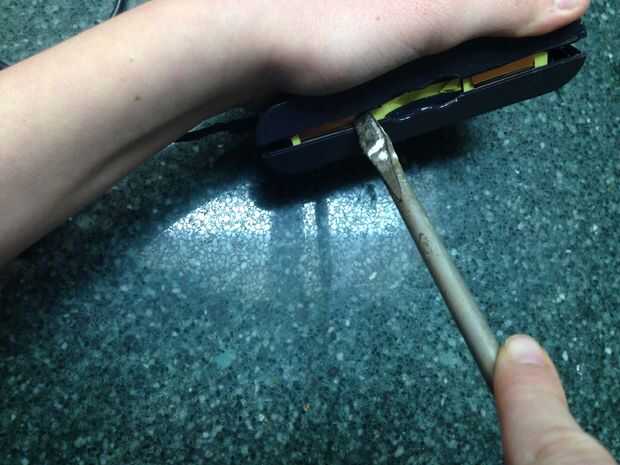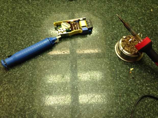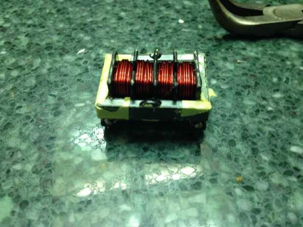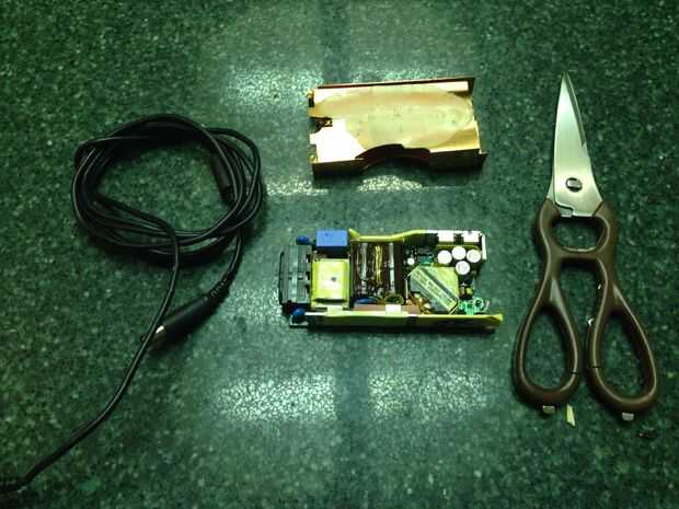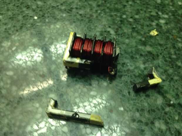 Necesitamos algunos hilos para hacer las bobinas en nuestro reactor de arco. Para esto tomamos el cable de un transformador de un adaptador de CA, tan caliente su hierro de soldadura/de-soldering. La mía es sólo un viejo cargador de portátil. Empezar por palanca abierta para entrar. A continuación, sitúe el transformador. Es generalmente un bloque cubierto de plástico amarillo o azul. De la soldadura. Si no sabes cómo hacerlo, cabeza a YouTube para encontrar a una buena guía. Ahora que tienes el transformador fuera, retire todas las cubiertas, y debe dejarse con cables visibles dentro de un asa de metal. Tratar de deshacerse del metal para permitir el acceso a los cables. Pude acaba de poner bastante esfuerzo de torsión en el metal con dos pares de alicates, que el metal solo por la mitad, pero es posible que un martillo o incluso una sierra. No dude en desentrañar completamente las bobinas a utilizar más adelante.