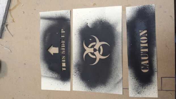 Encontré algunas imágenes en línea (símbolo de peligro) y escribe algunas palabras para imprimir en cartulina gruesa. Luego con mucho cuidado corte los Letras y símbolos para hacer una plantilla para la pintura a pistola. Puedes encontrar plantillas predefinidas en las tiendas de artesanía a usar. Por supuesto la caja hombre mira fresca por su cuenta sin cualquier decoración.