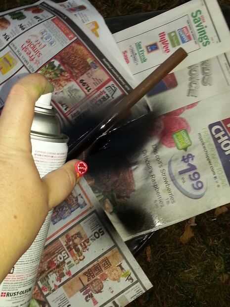 Aplicar pintura negra a la varilla de pasador y cortas ráfagas de pintura verde y negra del aerosol en la base de una maceta de terracota.