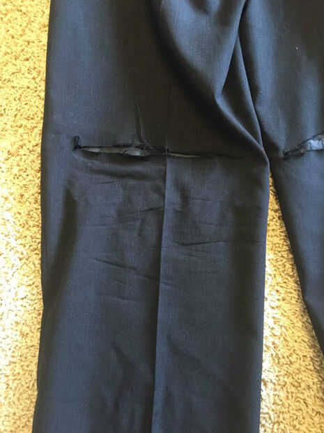 Corte una raja en el pantalón horizontalmente justo detrás de la suficientemente grande como para obtener el pie y la pantorrilla en la rodilla.