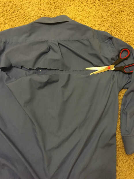 Corte una línea horizontal en la parte posterior de la camisa de manga larga de hombro a hombro (suficientemente grande como para conseguir su cabeza y los brazos a través de).
