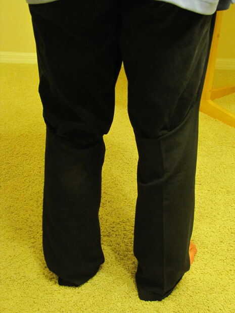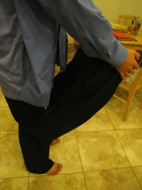 Poner en los pantalones de tamaño regulares. Luego pones los pies en las ranuras de los pantalones más grandes. Zapatos o quedarse descalzo si se prefiere.