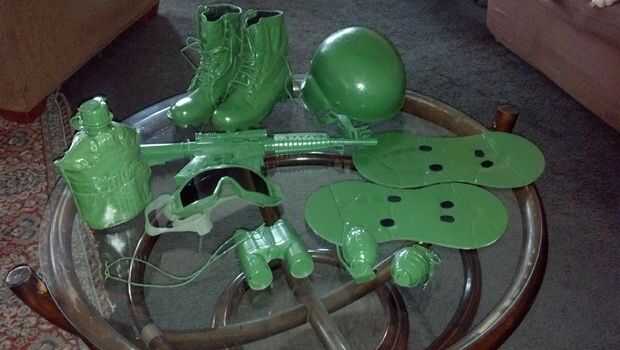 Empecé este traje con toda la pintura (ejército uniforme, mochila, partes de las botas de combate, titular de la cantina) los artículos de la tela con la pintura interior de brillo, esto actúa como un Imprimador/sellador por lo que no necesita tanta pintura en aerosol... Una vez que esta pintura tiene completamente seco con la pintura verde en aerosol y spray todos los elementos en la lista (2 capas) Asegúrese de dejar secos completamente entre capa y capa, luego rocíe todos los elementos con capa transparente de brillo, la tela puede necesitan 2 capas, use su juicio para que todo tiene un look plástico similar. El último elemento es las cartulina recortes para los pies, se puede crear cualquier forma que como luego pintura de aerosol de 2 capas de verde y 1 capa de clear. Una vez que ha secado la cartulina utilice las tiras de Velcro en la parte inferior de las botas y colocar sobre la cartulina.