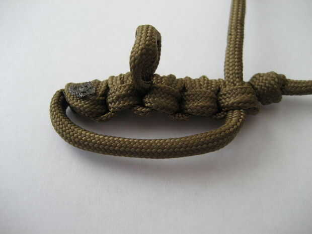 Agrandar el último lazo en la parte delantera de la culata de la pistola utilizando un lápiz. Doble el cable largo a la izquierda saliendo de la parte trasera de la culata de la pistola hacia el frente e Inserte el lazo. Esto formará la correa de la pistola. Ajustar el tamaño de Honda sobre el brazo y la cabeza de un hombre del ejército.