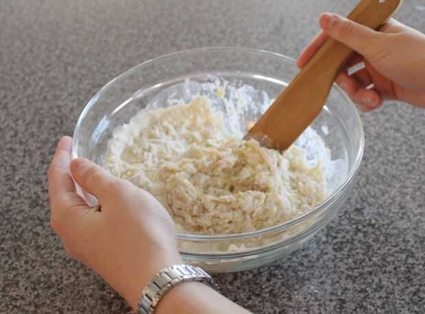 Mezclar el aceite y agua a los ingredientes secos, revuelva hasta que se forme una masa suave. Si la mezcla está demasiado seca y grumosa añadir pequeñas cantidades de agua hasta que esté suave (pero no pegajoso).