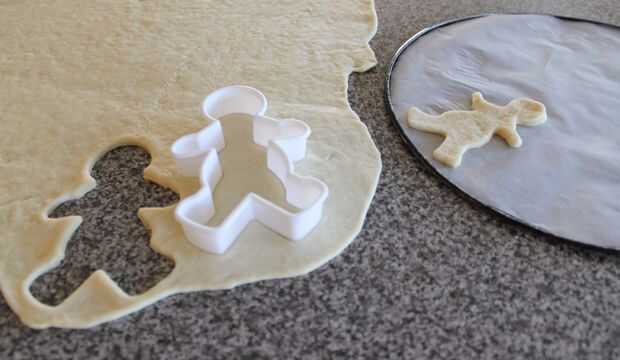Estirar la masa hasta que quede del grosor que quieras (5mm es bueno). Luego recorta sus poco hombres (las mujeres, chicas o chicos según el corte que tienes!) y ponerlos en una bandeja cubierta con papel impermeable a la grasa.