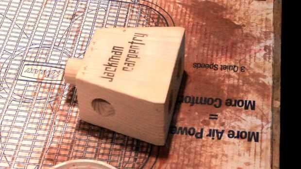 Yo también había sellado "Jackman carpintería" (mi apodo anterior) en el pecho utilizando la técnica de transferencia de tóner. Esto se hace mediante la impresión de una imagen espejada y entonces usando acetona frotada en el papel para transferir la imagen a la madera.